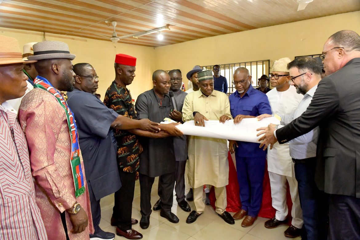 Officials of the Nigerian Local Contentment Development Board (NCDMB), and other stakeholders of Oloibiri Museum and Research Center (OMPRC), unveiling the Architectural Plan, during the handing over of the project Site Plan to Julius Berger Plc at Otuabagi community Town Hall Ogbia LGA Bayelsa State.