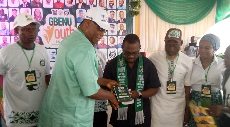 Chairman, Badagry West Local Council Development Area,, Mr Joseph Gbenu (2nd L), decorating the Managing Director, RAFTOP Homes, Dr David Assogba, during the Gbenu Youth Engagement Summit on Catalyst in Lagos on Wednesday (2/7/25).