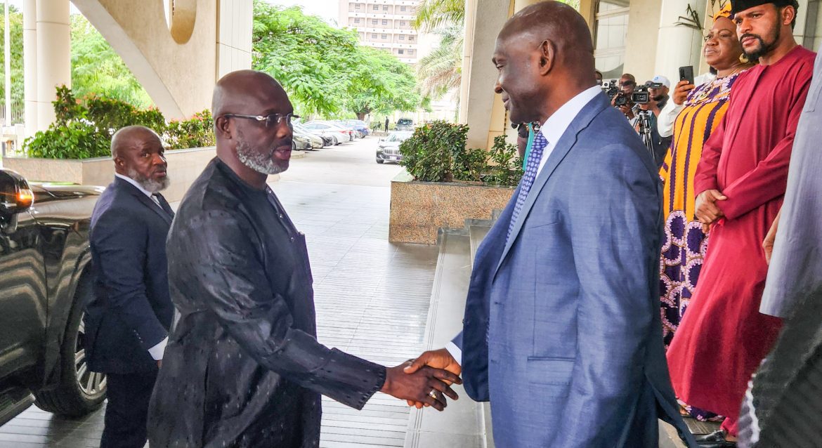 Chief of. Protocol Ministry of Foreign Affairs, Amb Wahab Akande (R), receiving the Former President of Liberia, George Weah to the Ministry to sign the condolence register of Late President Muhammadu Buhari in Abuja on Thursday (17/7/25).