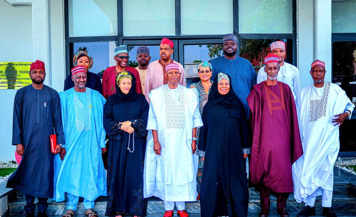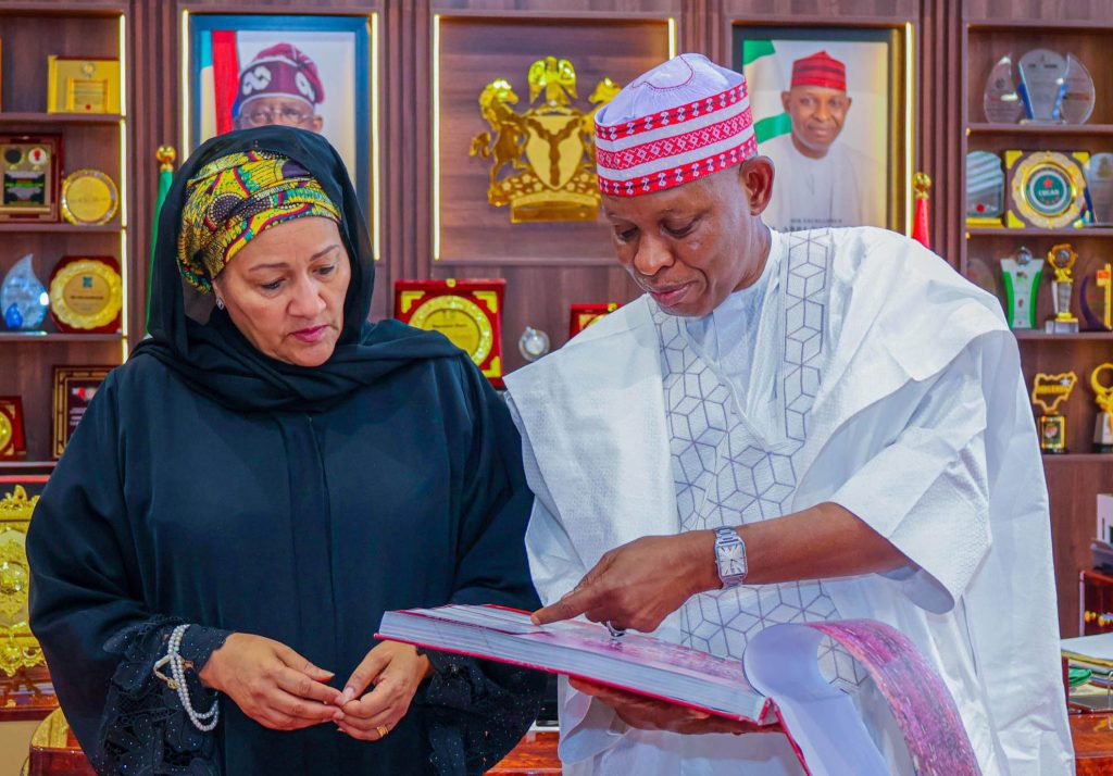 Governor Abba Yusuf of Kano State (M); Deputy Secretary General of the United Nations, Amina Mohammed (3rd L) and others during her courtesy visit to the Government House in Kano.