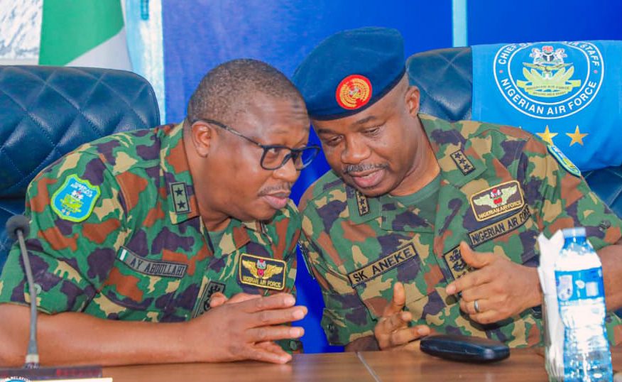 Chief of the Air Staff (CAS), Air Mashal Sunday Aneke (R) and Chief of Policy and Plan, Nigerian Air Force, AVM Abubakar Abdullahi, during the CAS maiden meeting with branch chiefs and air officers in Abuja on Thursday (6/11/25).