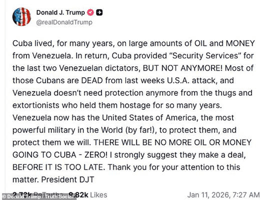 In a fiery Truth Social post, Trump declared that Cuba’s decades-long reliance on Venezuelan oil and financial support has ended, following a U.S. military strike that he claimed killed many Cuban operatives stationed in Venezuela.