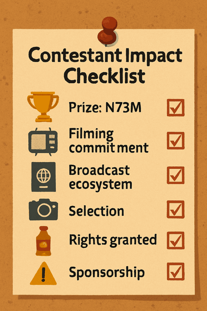 The ₦73 million prize is reserved for the winner. Public materials do not indicate stipends for other contestants beyond accommodation and transport. Filming is scheduled in Lagos between mid-March and early April 2026, requiring contestants’ full commitment during production. The programme will air on Africa Magic via DStv, firmly within a commercial broadcast ecosystem supported by advertising and sponsorship.